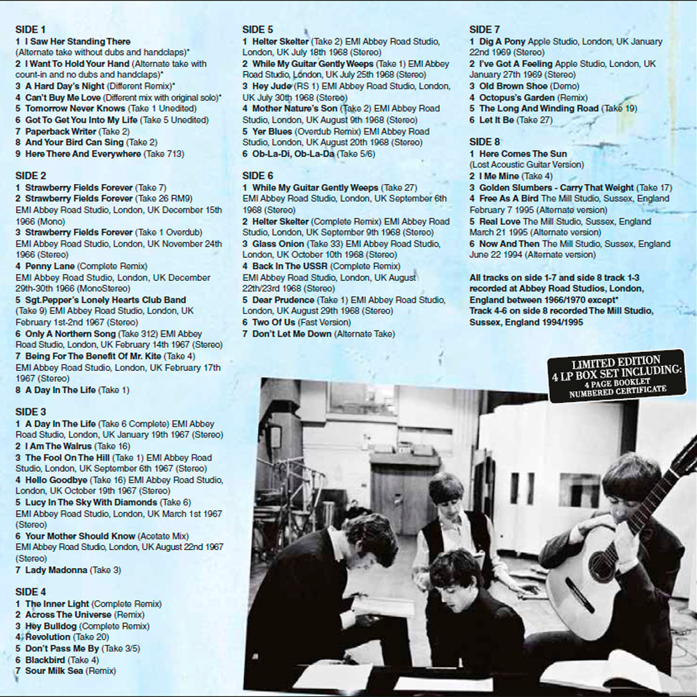 Tracks such as Let It Be, Here Comes The Sun, Free as a Bird, and Real Love include demos and alternate versions from the post-breakup and “Anthology” period.