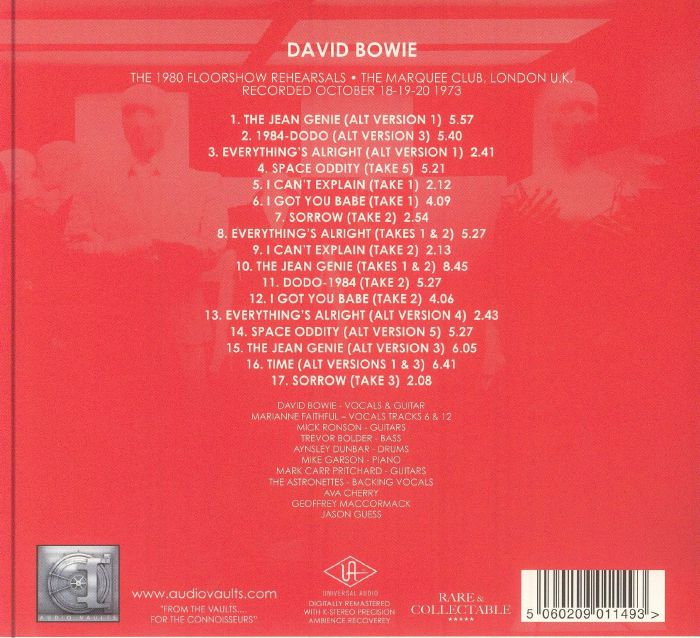 Recordings of David Bowie's rehearsals at the Marquee Club in London in October 1973, in preparation for a musical performance entitled "The 1980 Floor Show," which was broadcast on NBC in the US on November 16th as part of "The Midnight Special," and during which the English star donned the role of Ziggy Stardust for the last time. Bowie (vocals and guitar) is joined by Mick Ronson (guitars), Trevor Bolder (bass), Aynsley Dunbar (drums), Mike Garson (piano) and Mark Carr Pritchard (guitars), as well as backing vocals The Astronettes (Ava Cherry, Geoffrey MacCormack and Jason Guess) and special guest Marianne Faithfull (second vocals on Sonny & Cher's "I Got You Babe"), in a selection of songs (proposed in different takes) taken from the albums "Aladdin Sane" and "Pin-Ups", plus a medley of "1984" and the then unreleased "Dodo".