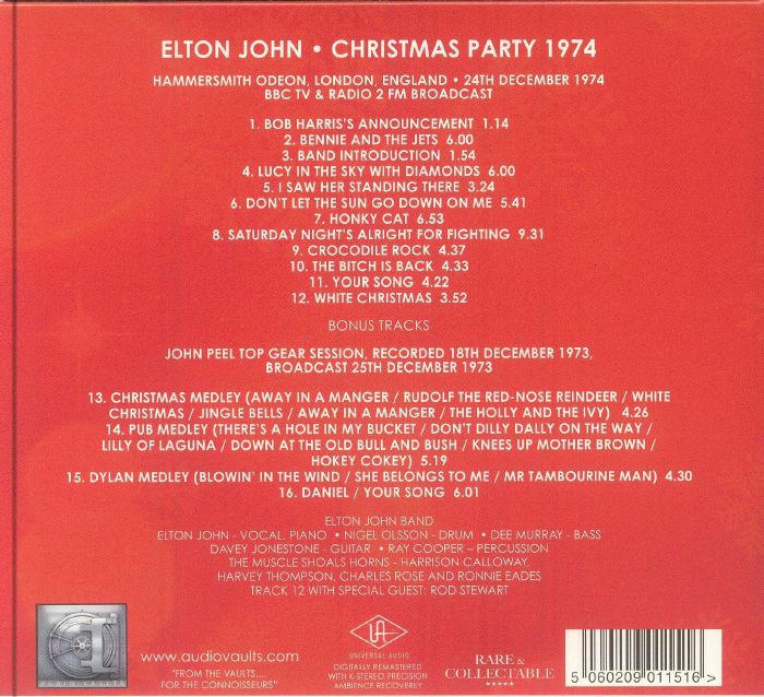 This release collects on a single CD two pre-Christmas performances by Elton John taken from radio and television programs in the 1970s. The main course consists of 10 tracks recorded on December 24, 1974 at the Hammersmith Odeon in London and broadcast at the time on both BBC TV and BBC Radio 2 FM: the setlist includes not only classics by the English singer and pianist such as "Bennie And The Jets", "Don't Let The Sun Go Down On Me", "Honky Cat", "Saturday Night's Alright For Fighting", "Crocodile Rock", "The Bitch Is Back" and "Your Song" but also the Beatles-esque "Lucy In The Sky With Diamonds" and "I Saw Her Standing There" as well as a closing "White Christmas" performed together with Rod Stewart, special guest of a band that, alongside the faithful Nigel Olsson (drums), Dee Murray (bass), Davey Johnstone (guitar) and Ray Cooper (percussion), includes the Muscle Shoals Horns section composed of Harrison Calloway, Harvey Thompson, Charles Rose and Ronnie Eades. The bonus tracks recorded on December 18, 1974 1973 for a John Peel Top Gear Session and broadcast the following Christmas Day instead include a "Christmas Medley", a "Pub Medley", a "Dylan Medley" and a version of "Daniel" paired with "Your Song"