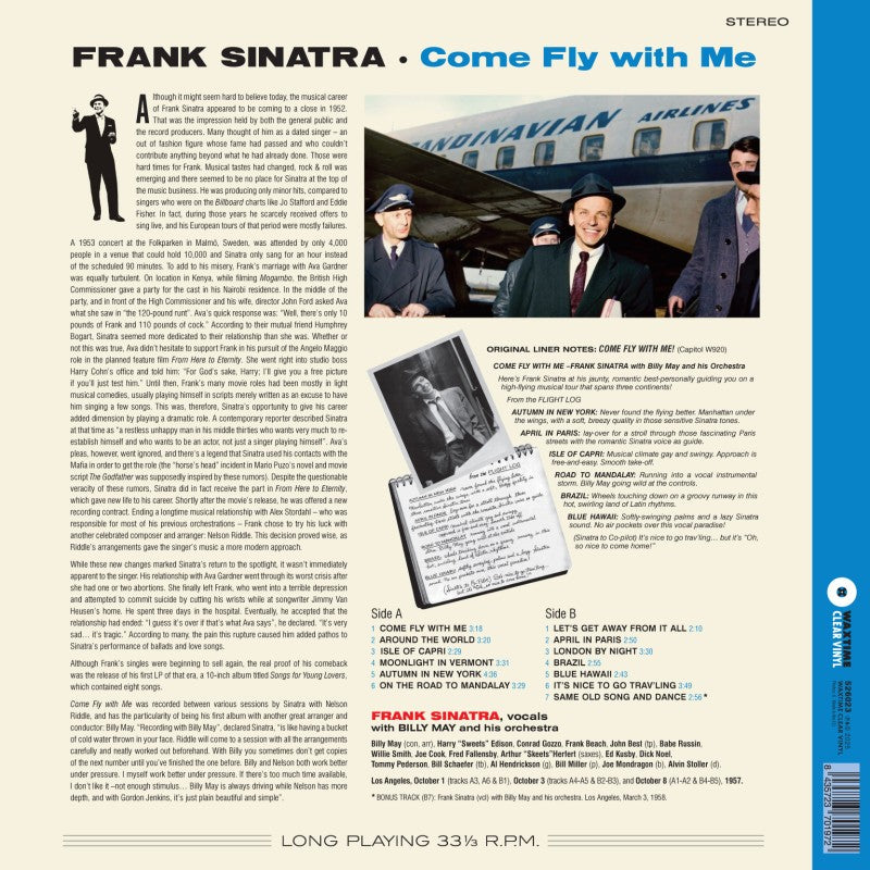 Come Fly with Me was recorded during a series of sessions in 1957 with Billy May conducting and arranging. It marked the first time Frank Sinatra recorded an entire album with May, following his many landmark collaborations with Nelson Riddle. Sinatra himself remarked: “Recording with Billy May is like having a bucket of cold water thrown in your face.” The album is thematic, with all the songs centered around the idea of travel, and became one of Sinatra’s most enduring works from his Capitol years.