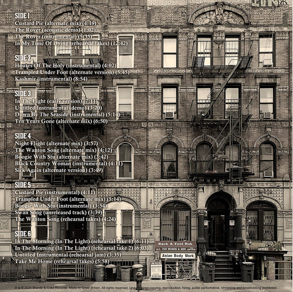 Limited Edition of only 300 numbered copies, this box set sifts through the unreleased material recorded by Led Zeppelin for the album "Physical Graffiti" released in February 1975. The three colored, heavyweight vinyl records, housed in a box set with a booklet and printed in just 300 numbered copies, contain an abundance of rarities, demos, instrumental versions, rehearsals, alternate versions, improvisations and outtakes such as the famous "Swan Song", an ambitious instrumental work in several sections including acoustic and orchestral parts that Jimmy Page drew on in 1977 for the live improvisations of "White Summer"/"Black Mountain Side" and later reworked by incorporating a part of it into the Firm song entitled "Midnight Moonlight" and released on the 1985 album of the same name.