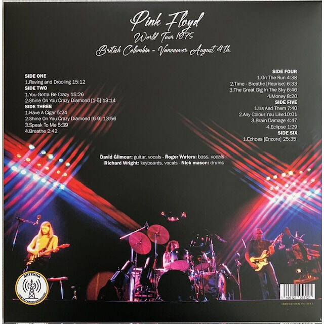 Not August 4, 1975 (as stated on the cover), but April 8, 1975, is the exact date of the concert Pink Floyd held at the Pacific National Exhibition Coliseum in Vancouver to open that year's North American tour. Antenna is now reissuing the concert on three limited-edition, numbered, "splatter" colored LPs. Five months before the release of "Wish You Were Here", Roger Waters, David Gilmour, Richard Wright and Nick Mason, accompanied by Dick Parry on saxophone and backing vocalists Venetta Fields and Carlena Williams aka The Blackberries, performed the multi-movement suite "Shine On You Crazy Diamond" and "Have A Cigar" from that album, opening the show with "Raving And Drooling" and "You've Got To Be Crazy" (later transformed into "Sheep" and "Dogs" for the "Animals" album) and dedicating the second part of the show to the complete rendition of "The Dark Side Of The Moon" and the encore "Echoes".