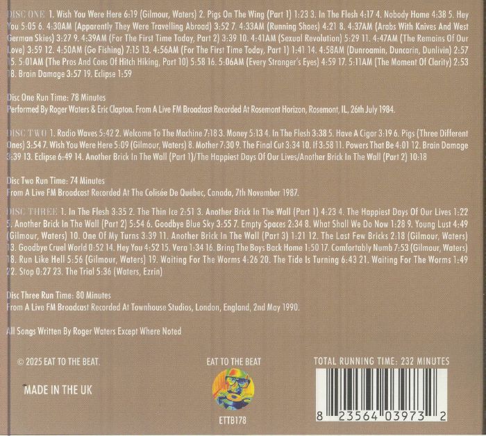 This 3CD collection celebrates Roger Waters’ artistry as a live performer, capturing the passion, precision and theatrical scope of his concerts. Featuring three definitive live broadcast recordings from his solo career, this new set presents some of his most powerful performances that demonstrate the scale, intensity and enduring vision that have made his shows legendary.