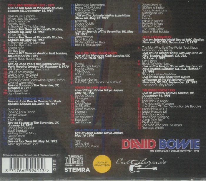 Eighty recordings taken from various radio and television performances make up the substantial content of this unofficial five-CD box set on the Cult Legends label, which covers almost thirty years of David Bowie's career from the beginning (1967) until 1995.